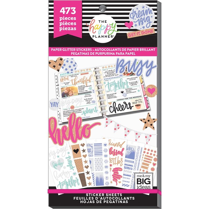 473 stickers Did you catch that? Four hundred and seventy-threestickers in ONE book! Helping you plan and giving you a boost of confidence along the way! These paper GLITTER stickers make it easy for you to customize your Happy Planner while adding a spark