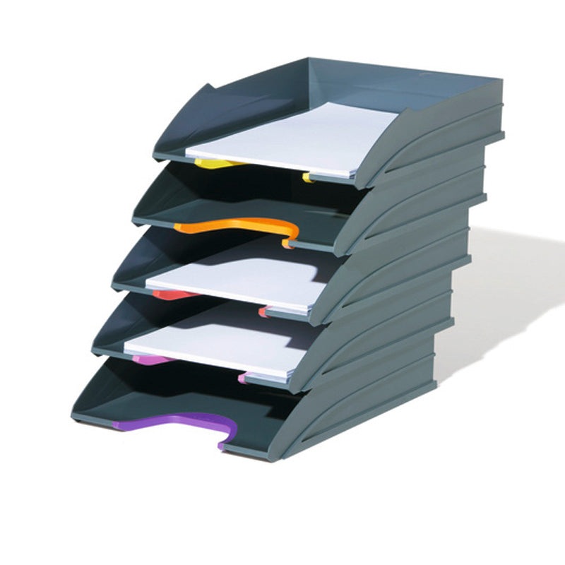 FeaturesMade in Europe from premium-quality plasticsCan be stacked one on top of the other or staggered for easier access to contentsTrays are Charcoal with Yellow, Orange, Red, Light Purple, and Purple accents DetailsOur Varicolor Adjustable Letter Trays