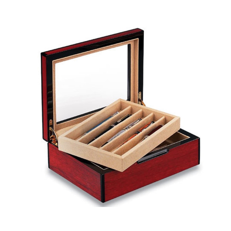The stunning good looks and museum quality finish of Venlo?s Exotic Wood Collection will leave you breathless. Venlo has circled the globe to find these exceptional wood cases made using time-honored traditional woodworking methods of Thailand. Combining function unmatched quality and superb pricing these cases are crafted in select woods that are finished with multiple layers of lacquer and hand-polished to showcase their rich natural tones. Each pen channel is deep enough to house an oversized Limited Edition pen and is richly padded in non-tarnishing cream colored suede providing security and comfort for your collection. A beveled glass top allows visibility while protecting your collection.