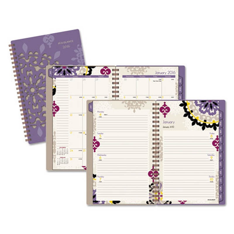 FeaturesTabbed monthly overview.Block weekly format.Past, current and future event months reference.DetailsClassic medallion design is given a twist when paired with these vibrant colors. Fun die-cut durable poly cover is great for both work and home! Mont