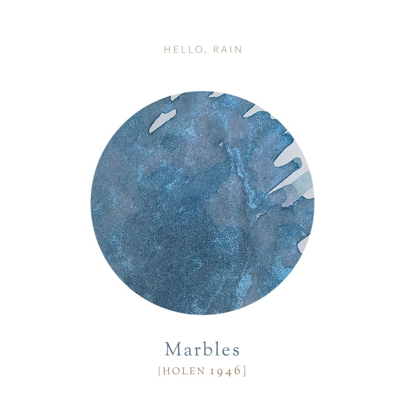 Vinta Inks Marbles [Holen 1946] 30mL bottled fountain pen ink. Holen is a dark blue and gray fountain pen ink with bright metallic blue shimmer.
