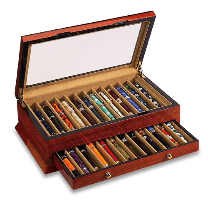 Vox Luxury Rosewood Veneer 24 Pen Case - PC-24B 24 pen slots on two levels bottom tray removable beveled glass thumb notches brass hardware non marking interior. Dimensions: 14 x 9 x 4 Note: pens are not included.