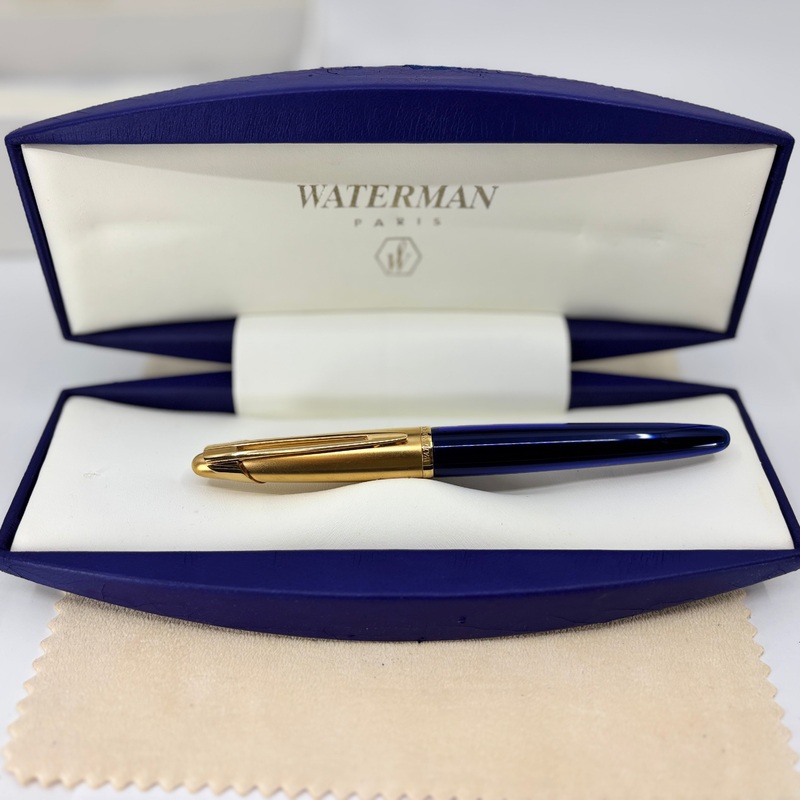 Waterman Edson Blue Fountain Pen - circa 2005. Gold Plated Cap & TrimCartridge/Converter Fill with Original Blue Converter Included.Virtually Mint condition - Made by Waterman in France.Nib is 18K750 Medium size.A true Iconic Waterman Fountain Pen !Origina