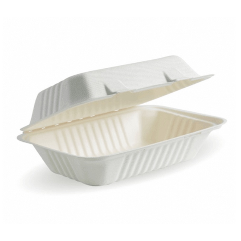 Our clamshells are plastic-free, made from rapidly renewable sugarcane pulp, a by-product of the sugar refining industry. Certified home compostable and carbon neutral.Product size: 229mm L x 152mm W x 81mm HCarton size: 45cm L x 33cm W x 25.5cm HCarton to