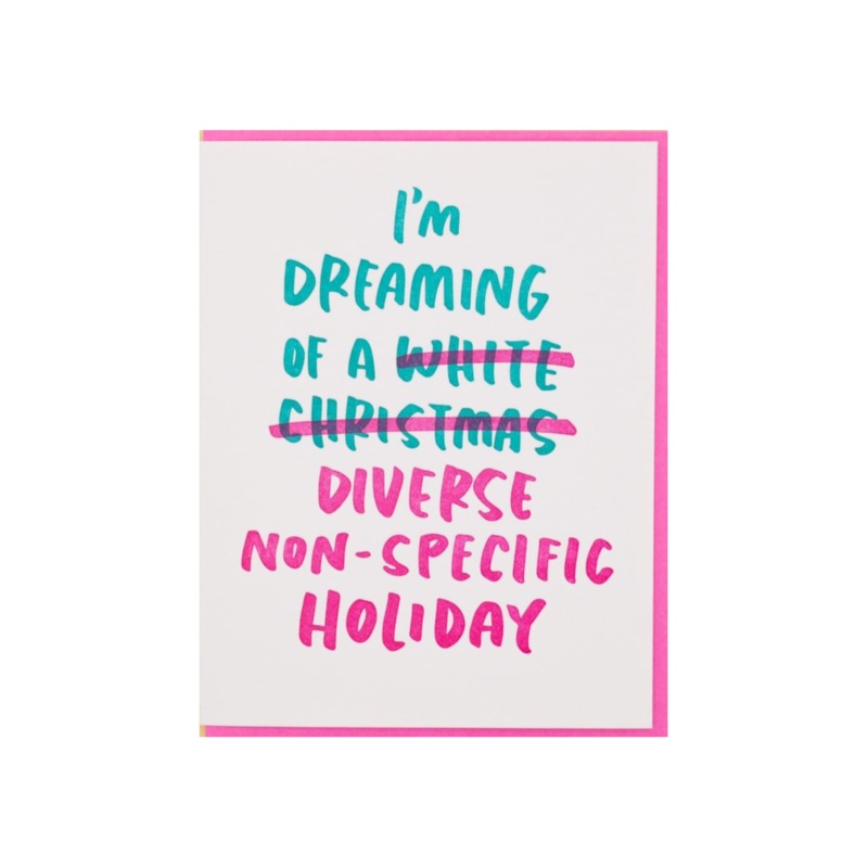 Instead of dreaming of a white Christmas, this year I'm dreaming of a diverse, non-specific holiday.Size:A2 (4.25" x 5.5")Blank insideIncludes envelopeLetterpress printed on 100% cotton paper.Made in the United States of America