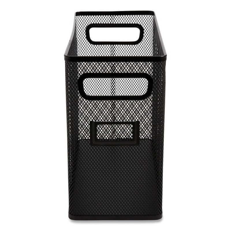 Line up several vertical organizers along a table or desk to create a coordinated filing system. Unique, box-style design, with integrated handles and front-facing label holder, accommodates binders, notebooks, paper pads, file folders, forms and documents. A sleek design aesthetic featuring a solid metal base, a tightly woven metal-mesh body with reinforced ribbing and a flat-square frame with rounded edges delivers reliable performance with a contemporary, professional flair. Integrated rubber feet enhance stability while providing reliable worksurface protection. Number of Compartments: 1; For File Size: Letter; Load Orientation: Front; Color(s): Matte Black.