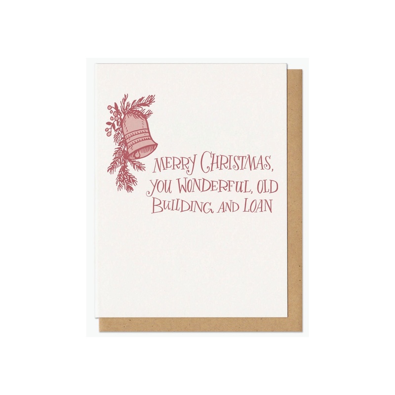 Merry Christmas, you wonderful, old building and loan.Printed in Providence, RI.A2, 100#, 100% recycled white paper.A2 sized kraft paper envelope.Blank insideSealed plastic sleeve.