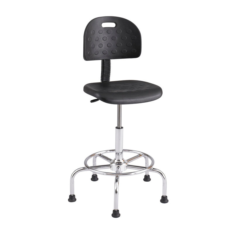 DetailsIndustrial height stool features a solid molded polyurethane seat and back.Welded steel elevated five-spoke tubular base with attached 18" fixed foot ring. High-lift pneumatic seat height adjustment is standard. Simple mechanism manual back height a