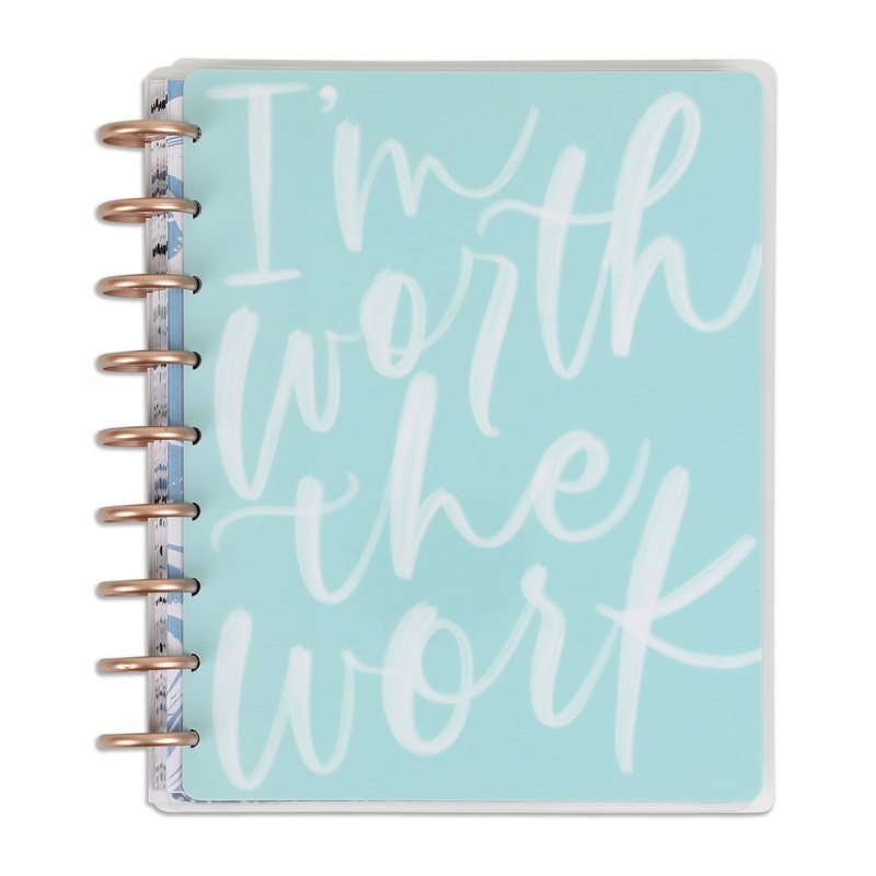 - Laminated light blue cover with “I’m Worth the Work” on the front. Features gold plastic discs.