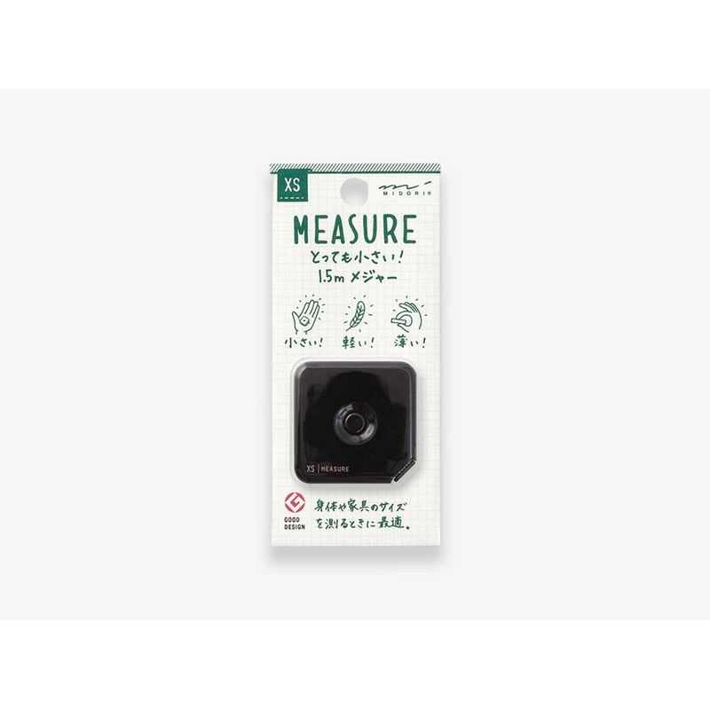 Midori’s XS Measure is a pocket-sized measurethat has a measuring ribbon of 1,5m in increments of 5 cm. Every 5 cm is alternated in a black and white pattern, making it easy to read. In addition, you can hear a subtle click, indicating the 5 cm interval. In the middle of the device is a button, to retract the ribbon. It features a small edged corner where you can click the ribbon handle when the measure is not in use.