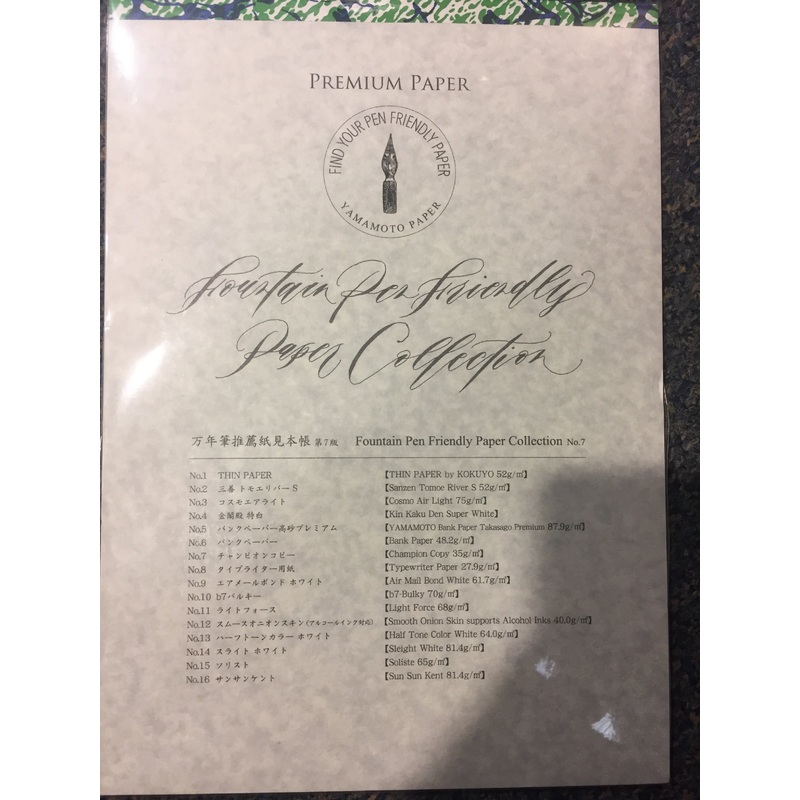 Yamamoto Fountain Pen Friendly Japanese Paper sample papers in a BOOK!5 pages of each:No.1Thin Paper by Kokuyo 52gNo.2 Sanzen Tomoe River 52g No.3 Cosmo Air Light 75g No.4Kin Kaku Den Super White No.5Yamamoto Bank Paper Takasago Premium 87.9gNo.6Bank Paper