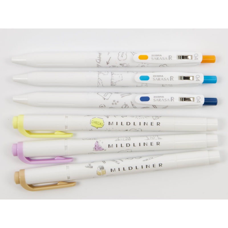 The limited edition Zebra White Lines designs are available as individuals of three MildLiner colors and three Sarasa R in .4mm. The complete set line-up is also available.MildLiners: Sherbet Yellow, Lilac, and BeigeSarasa R: Orange, Sky Blue, and Blue Gra