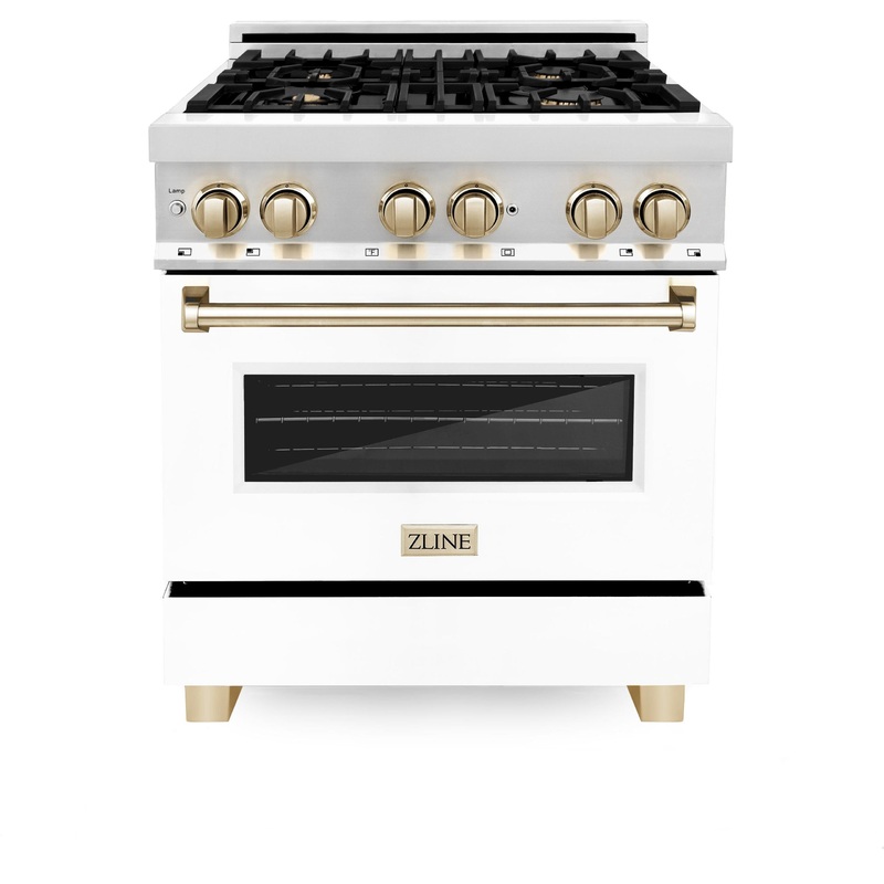 ZLINE Autograph Edition 30 in. 4.0 cu. ft. Dual Fuel Range with Gas Stove and Electric Oven in Stainless Steel with White Matte Door and Accents (RAZ-WM-30) [Color: Gold] – (RAZWM30G)